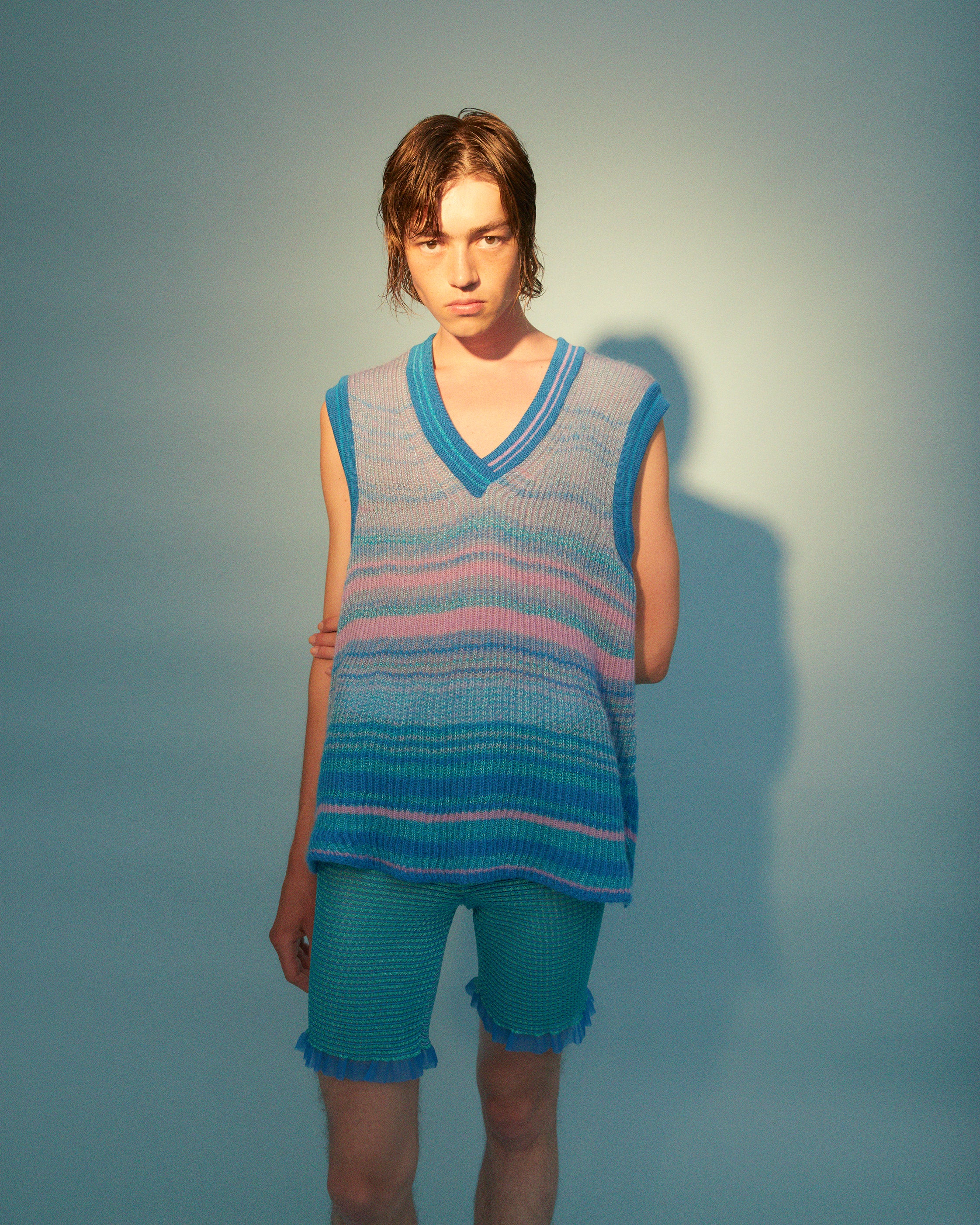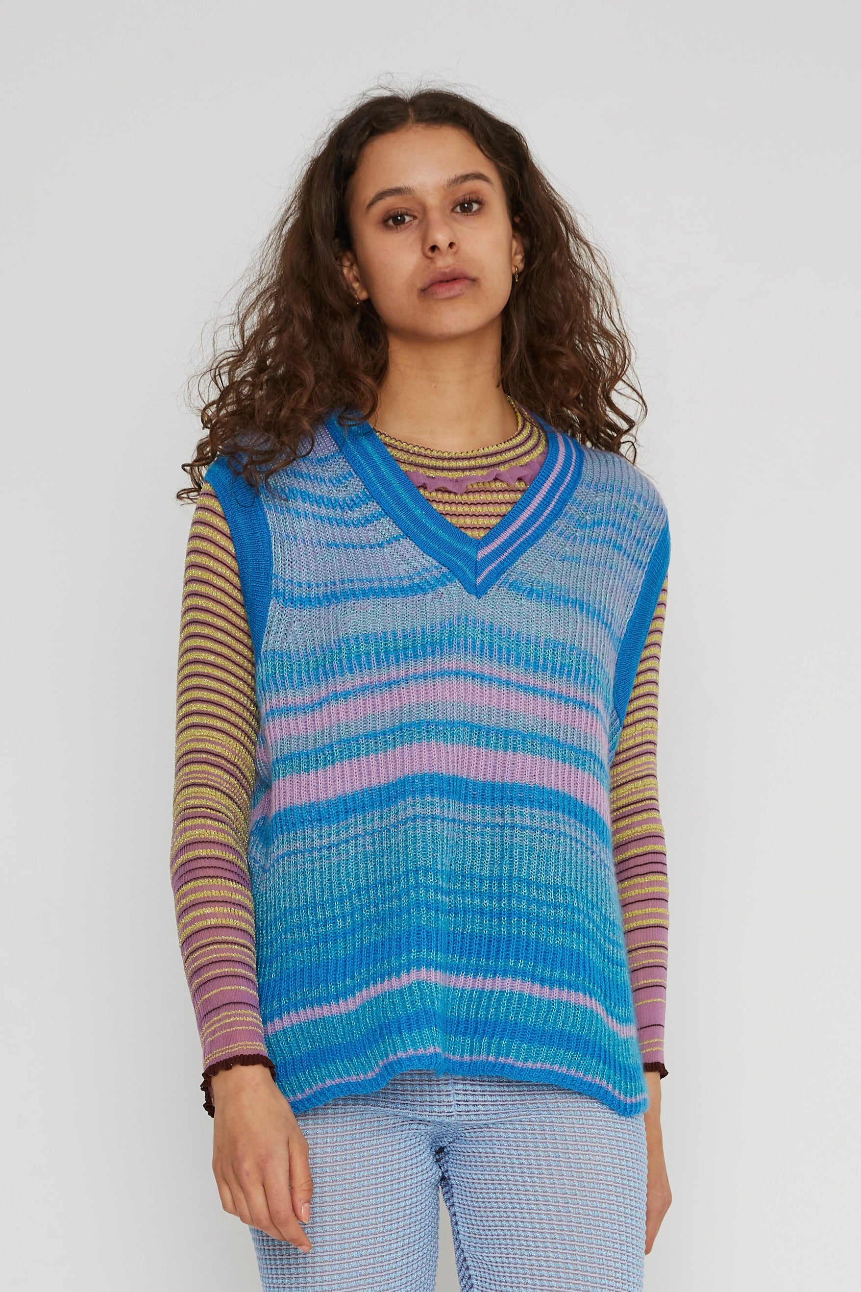 Knitted oversized v-neck vest with gradient stripes. The textiles are very soft, airy and lightweight. This vest is cut for a loose fit, therefore one size fits multiple sizes. This item is from Collection 3.