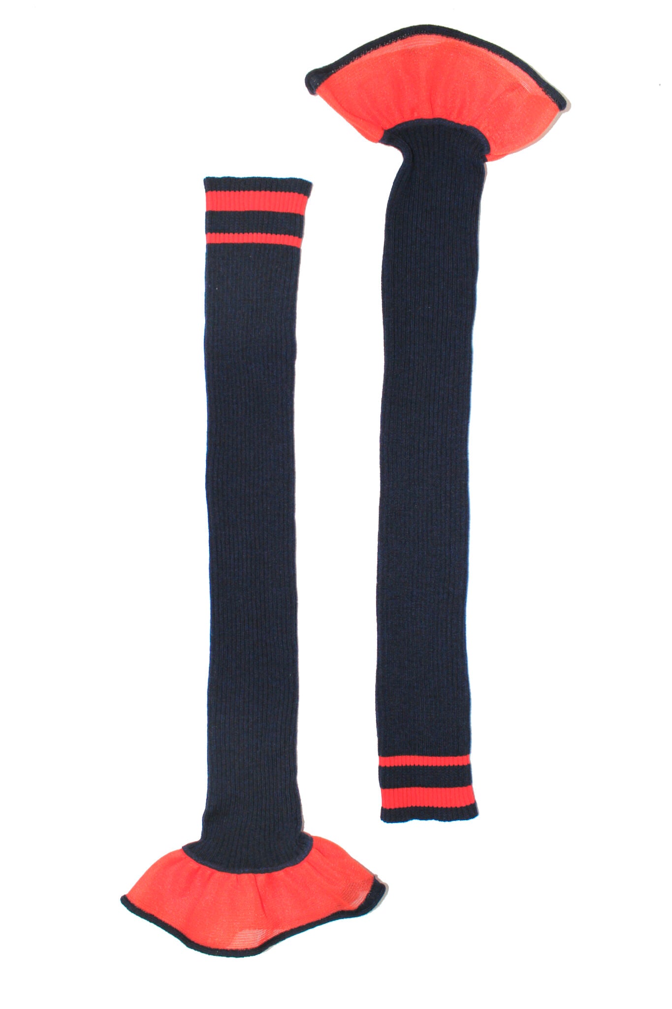 Wool Frills are a knitted pair of leg warmers in merino wool. Detailed with bold sporty stripes and a transparent ruffle. The textile is soft, non-itchy and very stretchy. Can be worn on both the arms as well as the legs. The Wool Frills are a functional styling piece, that will keep you warm.