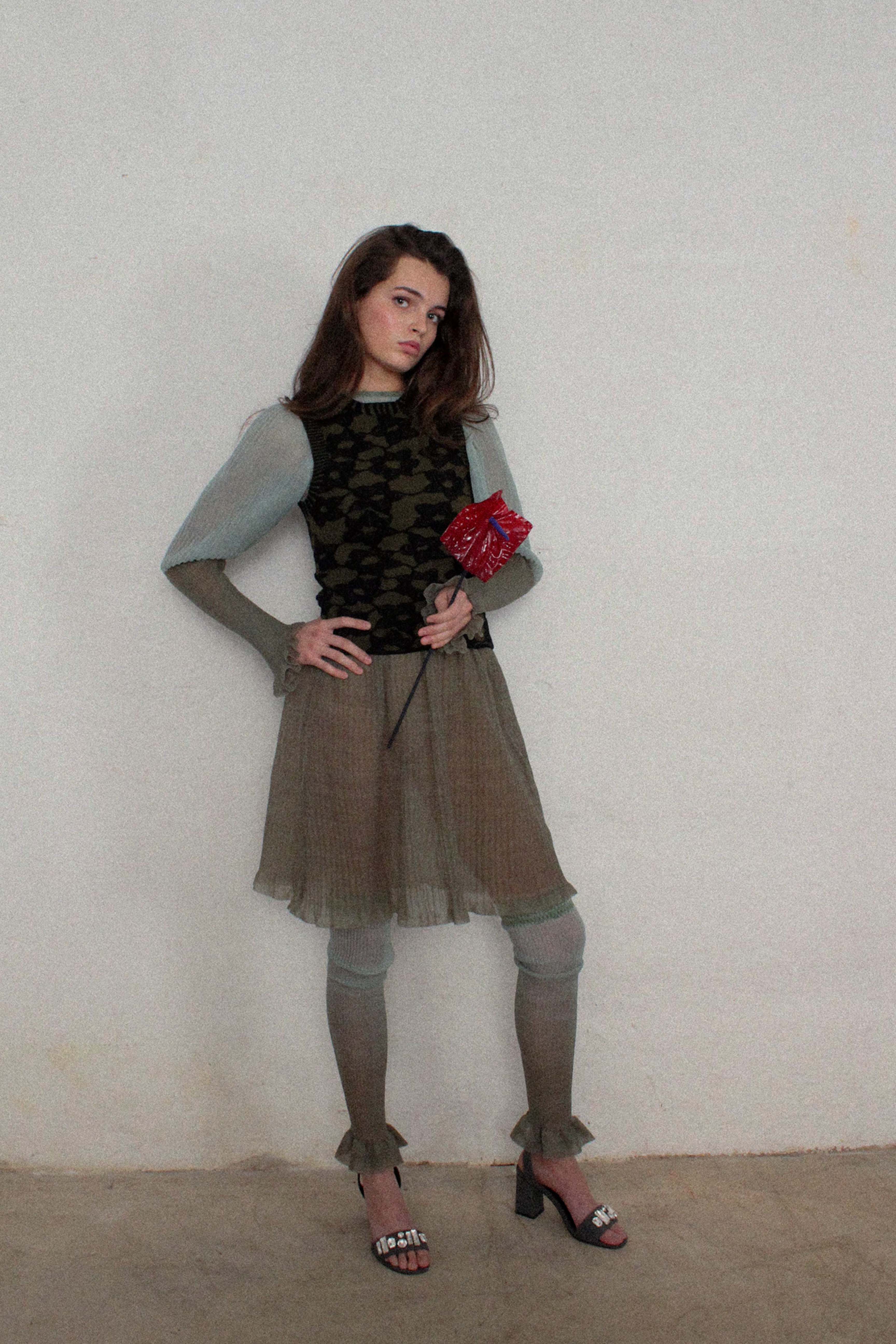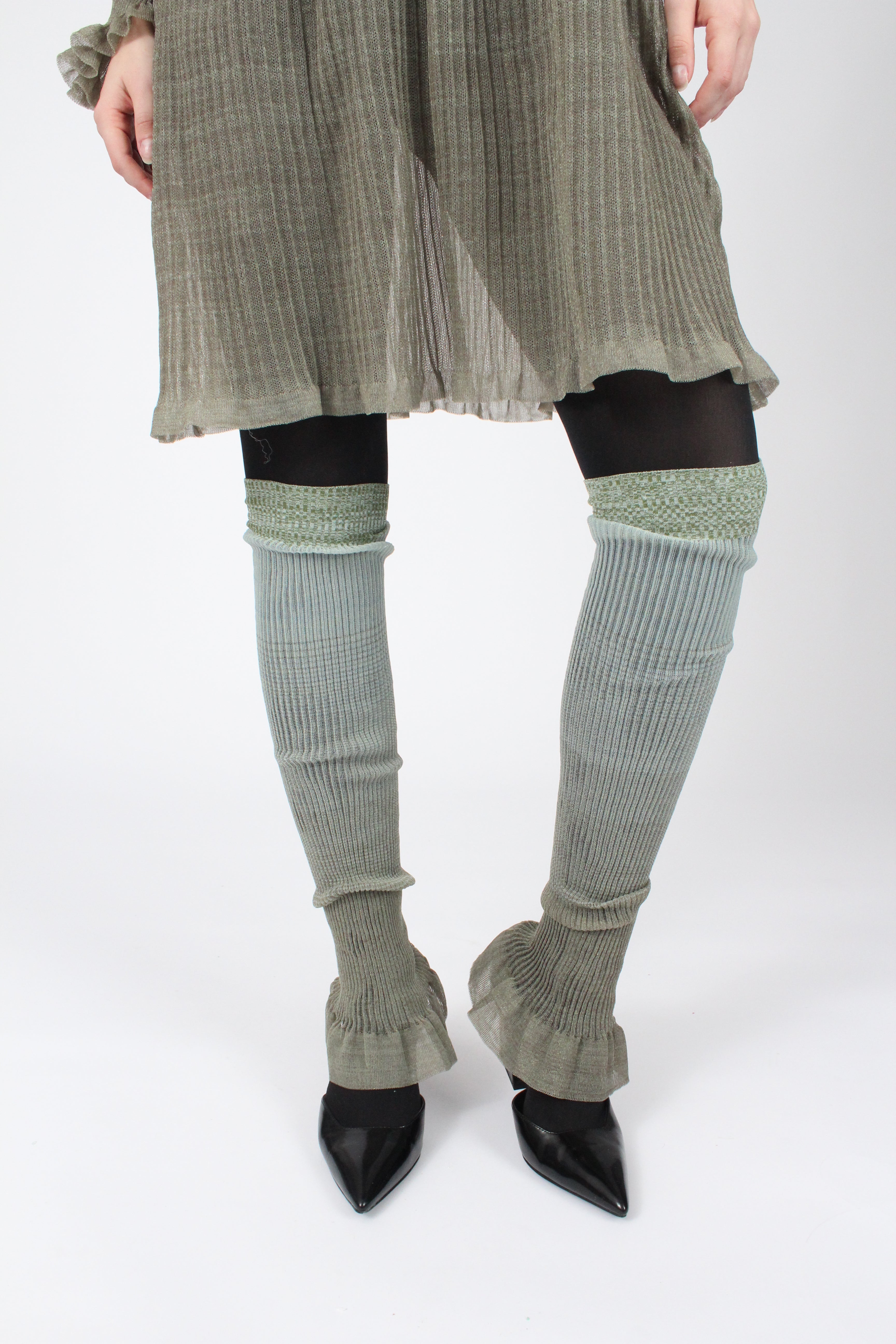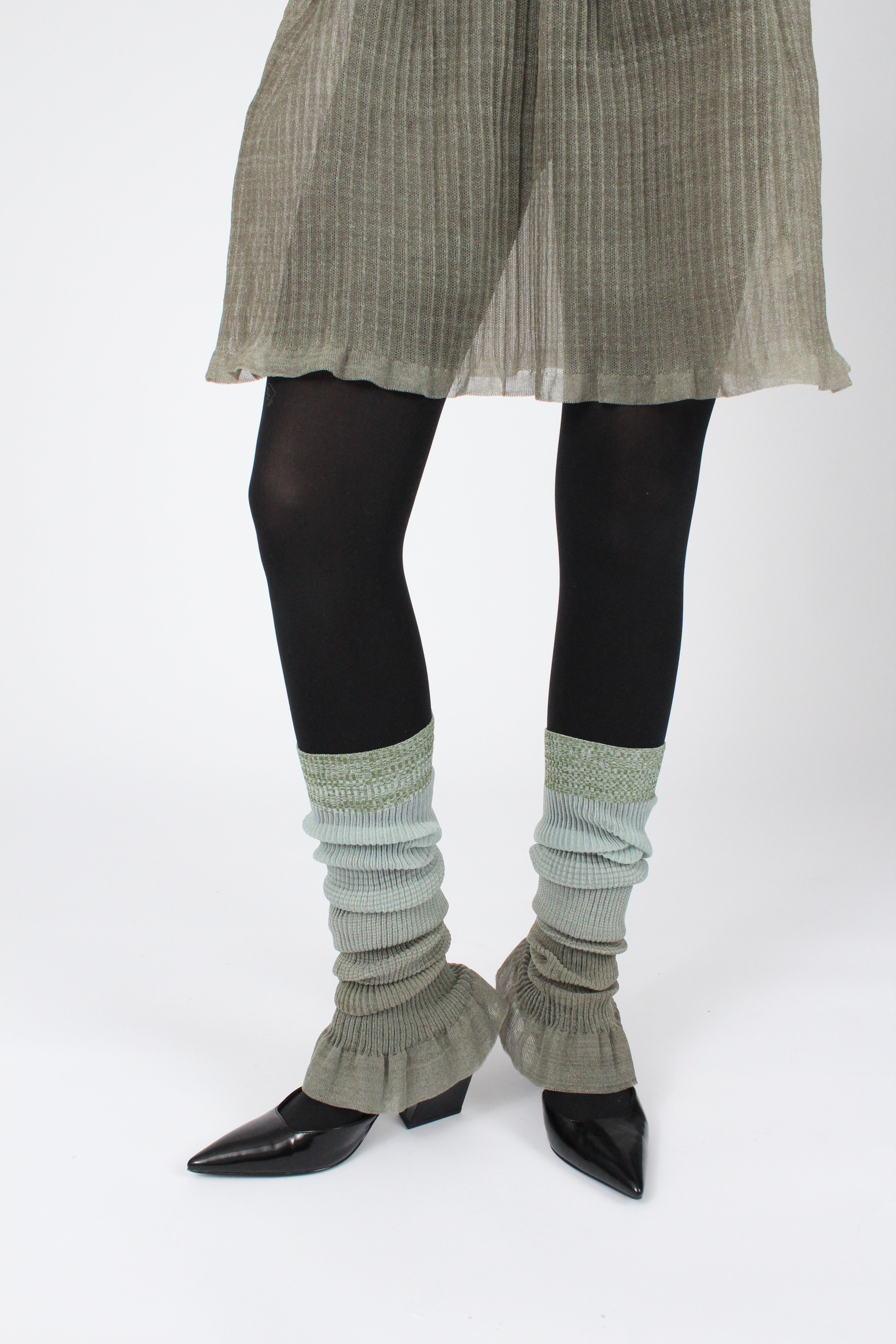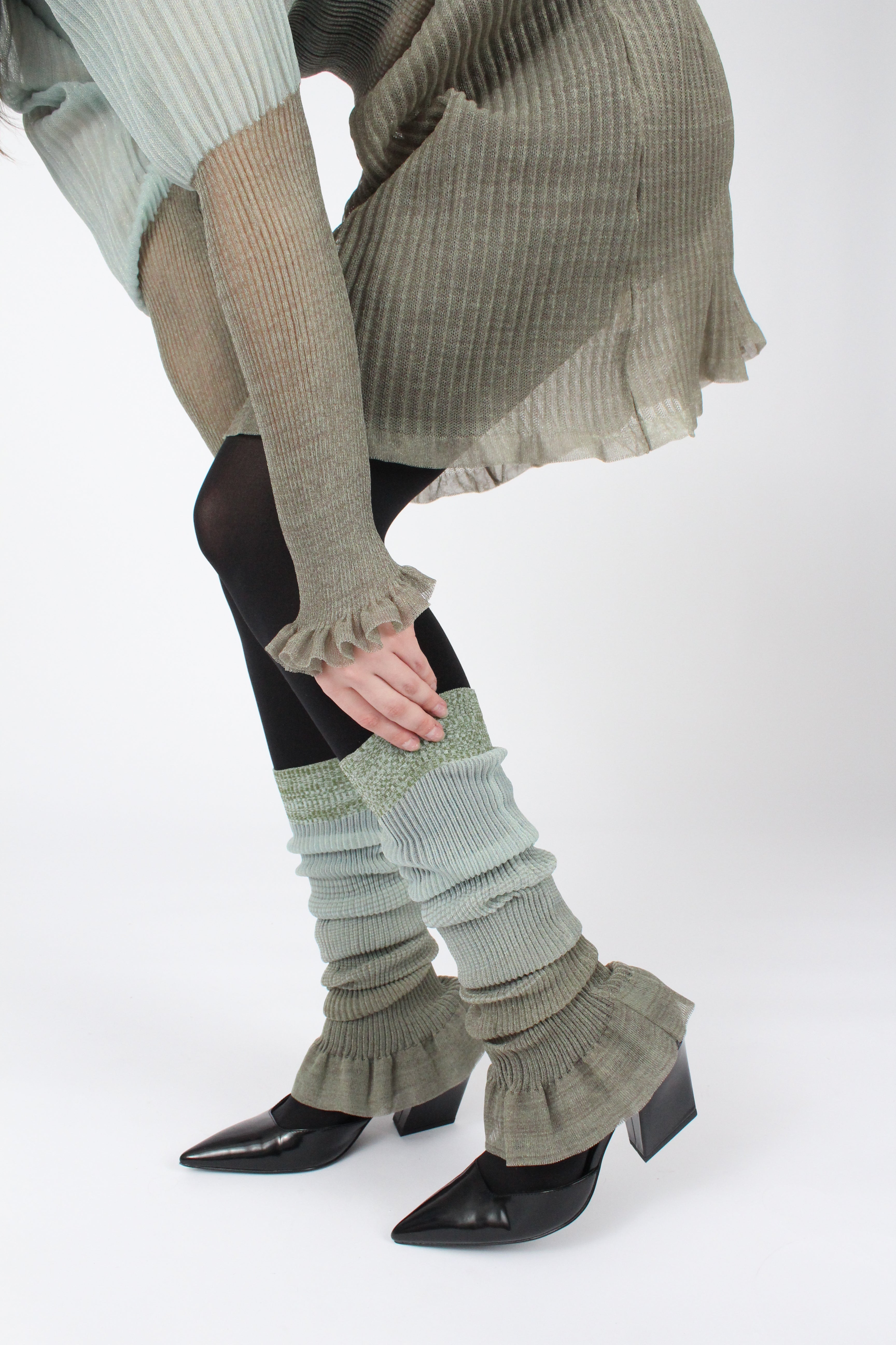 Gradient Frills in green/grey are a knitted pair of transparent frills in a gradient colour palette. The textile is lightweight, delicate and very flexible. Wear it on the legs or on the arms, for a captivating unique look.
