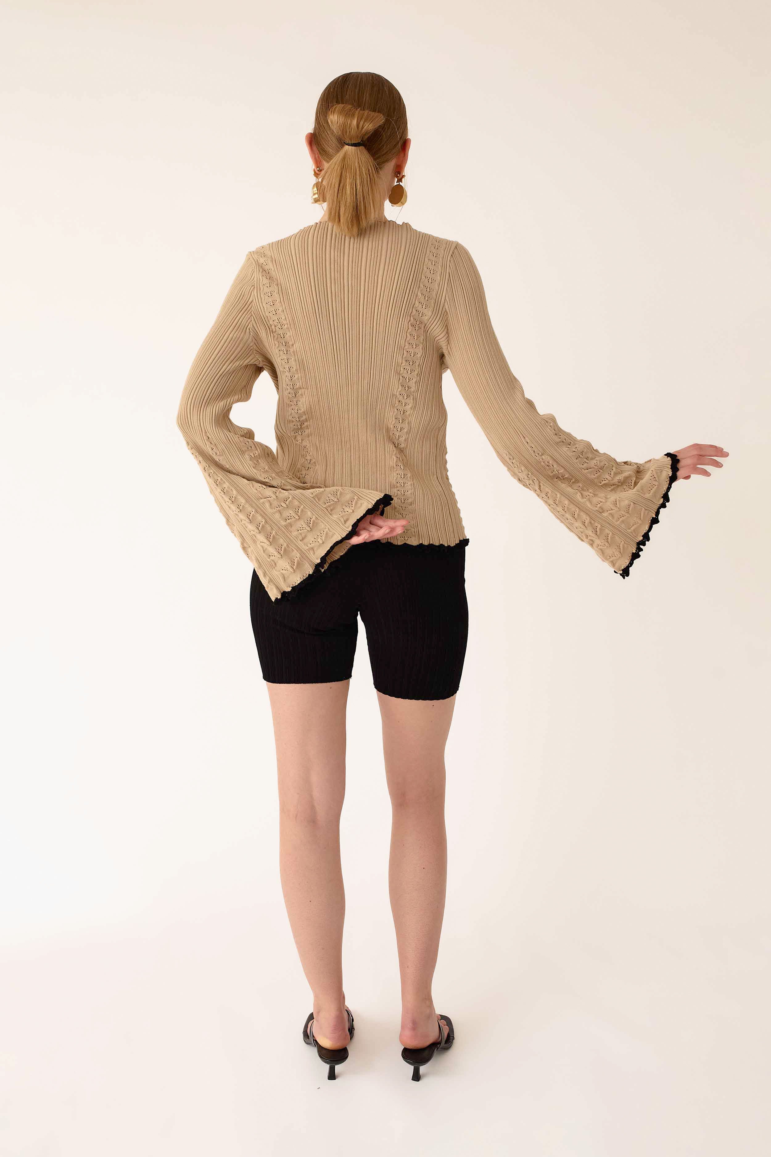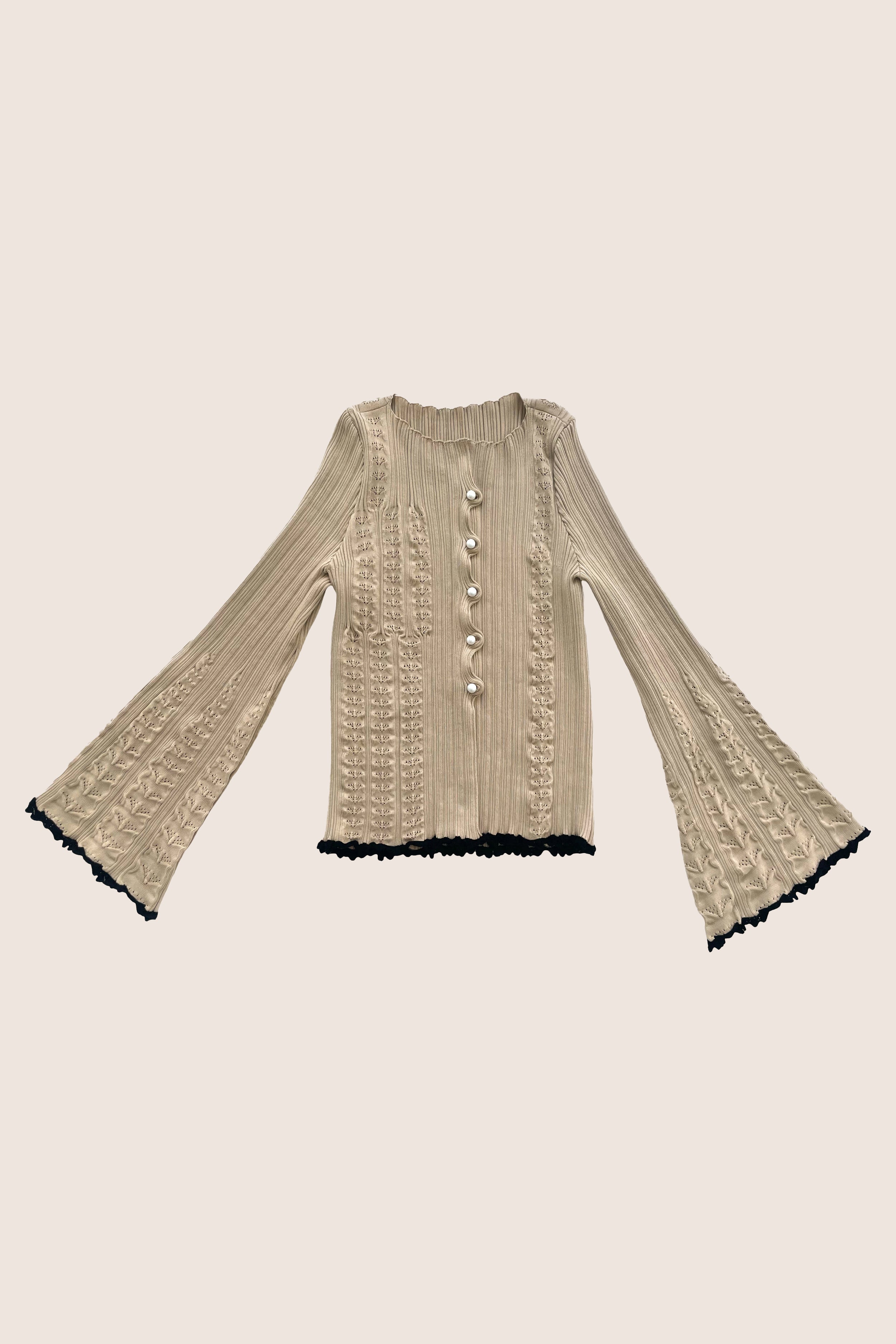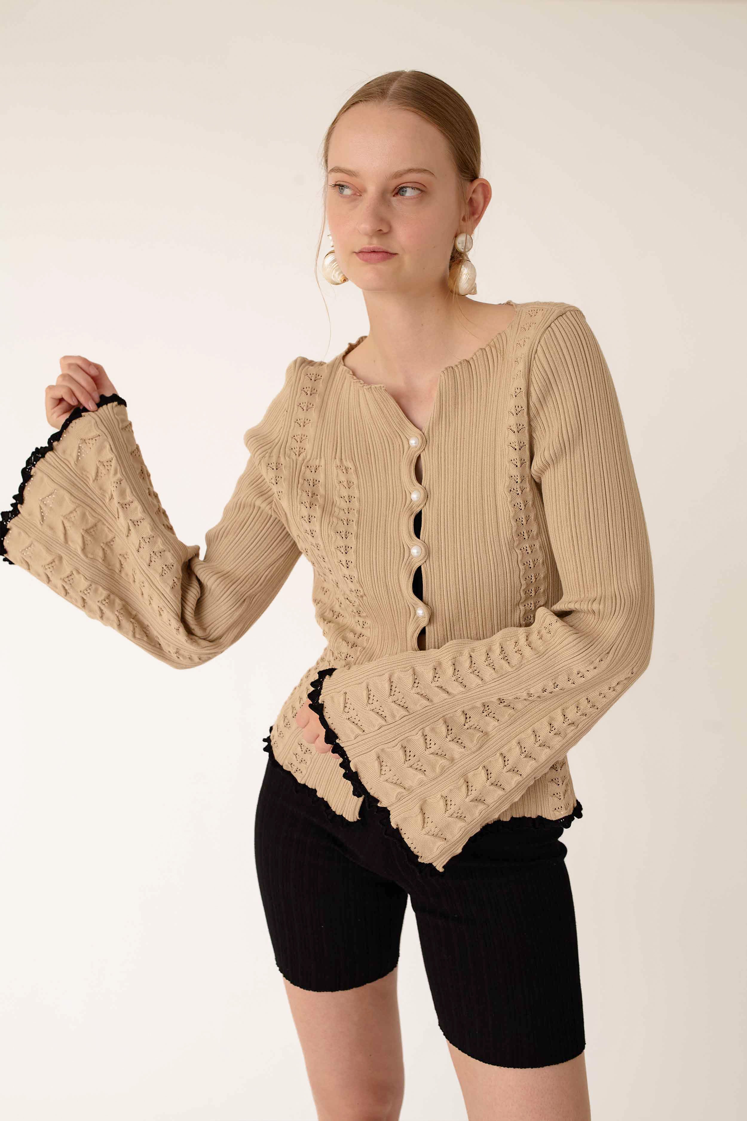 Lace Cardigan in sand is a knitted cardigan with long flared sleeves. The cardigan has an all-o­ver rib and with small lace pattern details. The cardigan has pearl buttons on the front. The fabric is knitted in a soft and non-itchy ECO Cotton yarn.