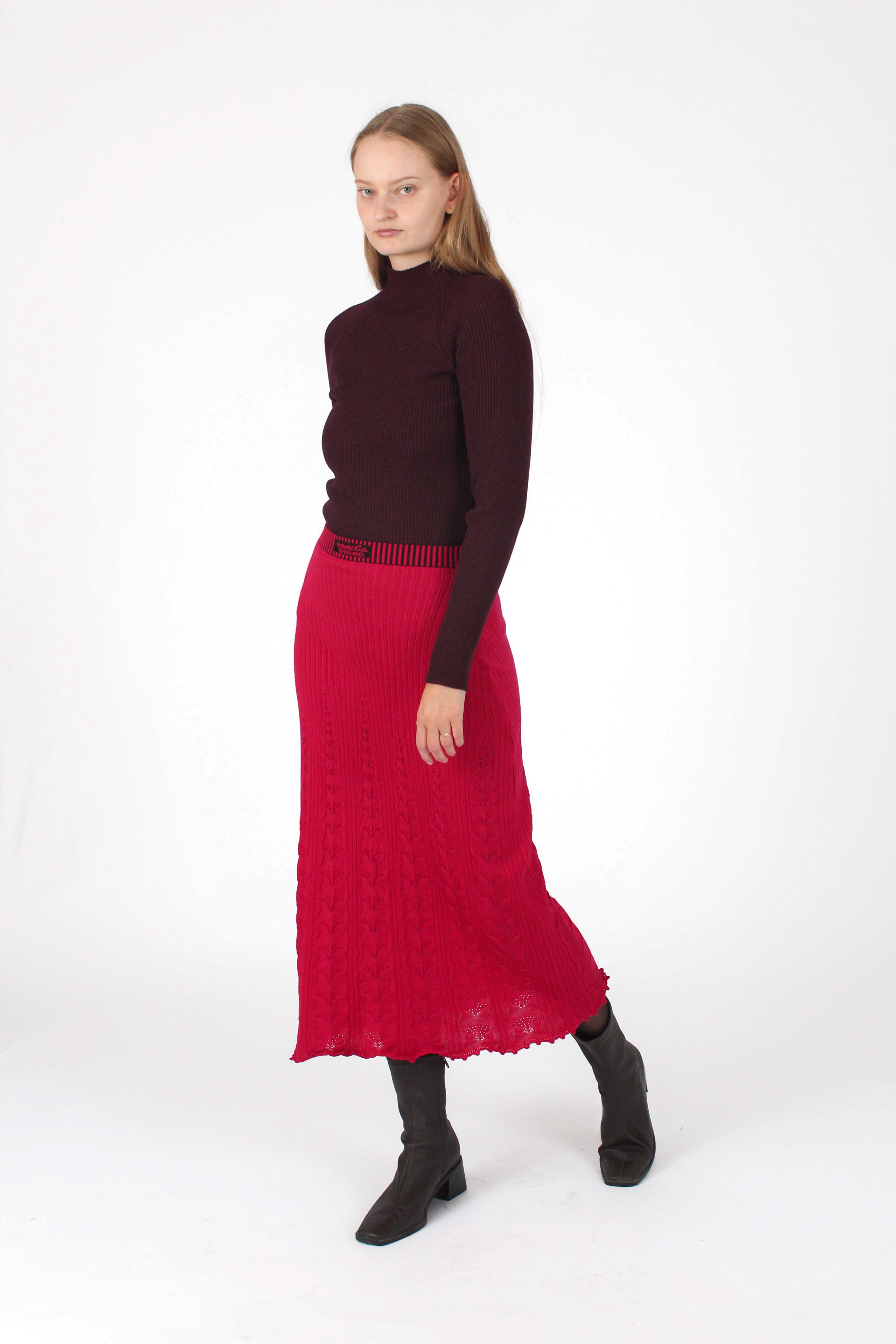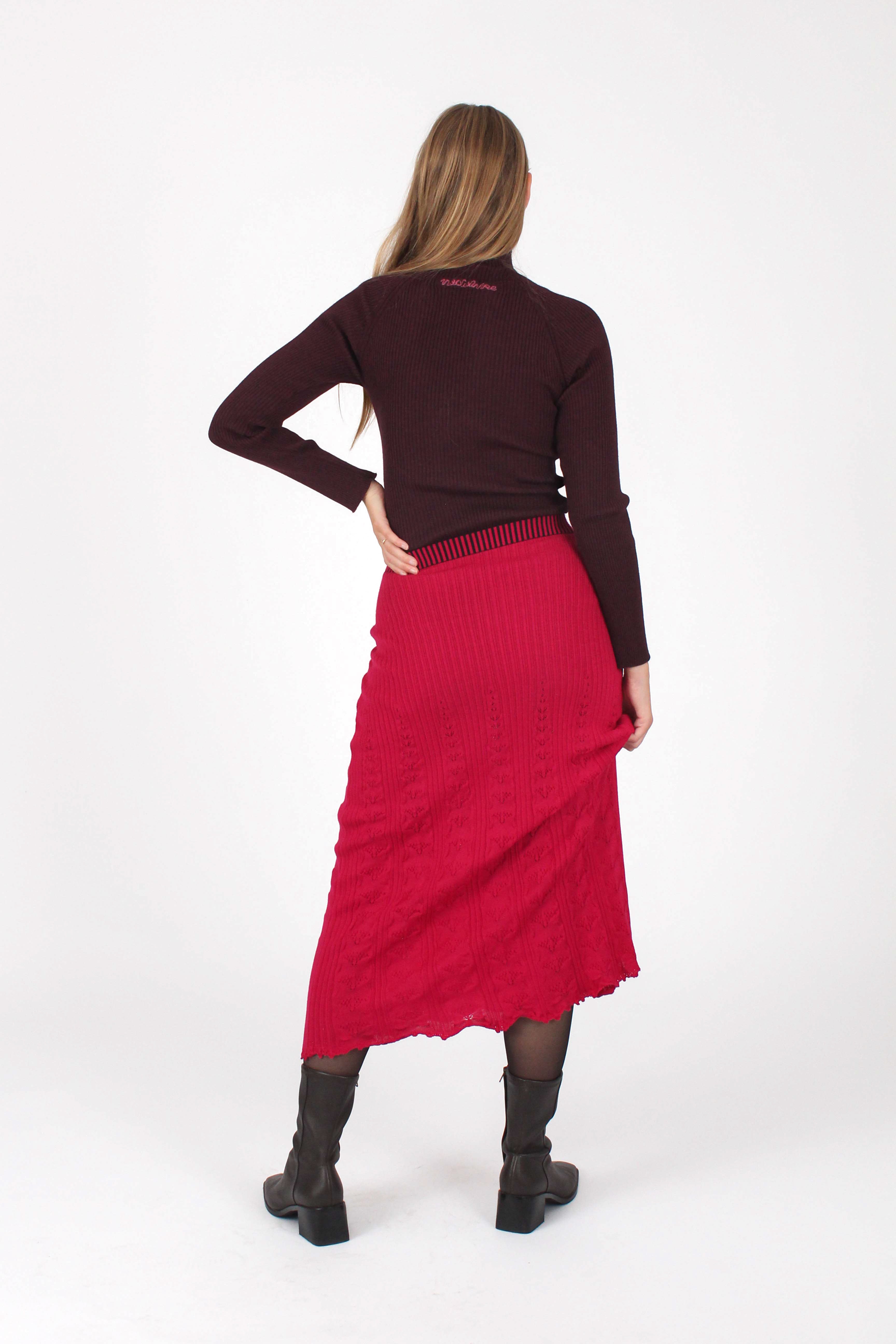 The Lace Wool Skirt combines comfort with elegance, made in an ultra soft merino wool. The ribbed knit structure offers a naturally flexible fit, while delicate lace-inspired details add a touch of femininity. Designed in a bold pink shade, this skirt brings warmth and vibrancy to your wardrobe, making it perfect for both everyday wear and special occasions. The elastic waistband ensures comfort and flexibility.