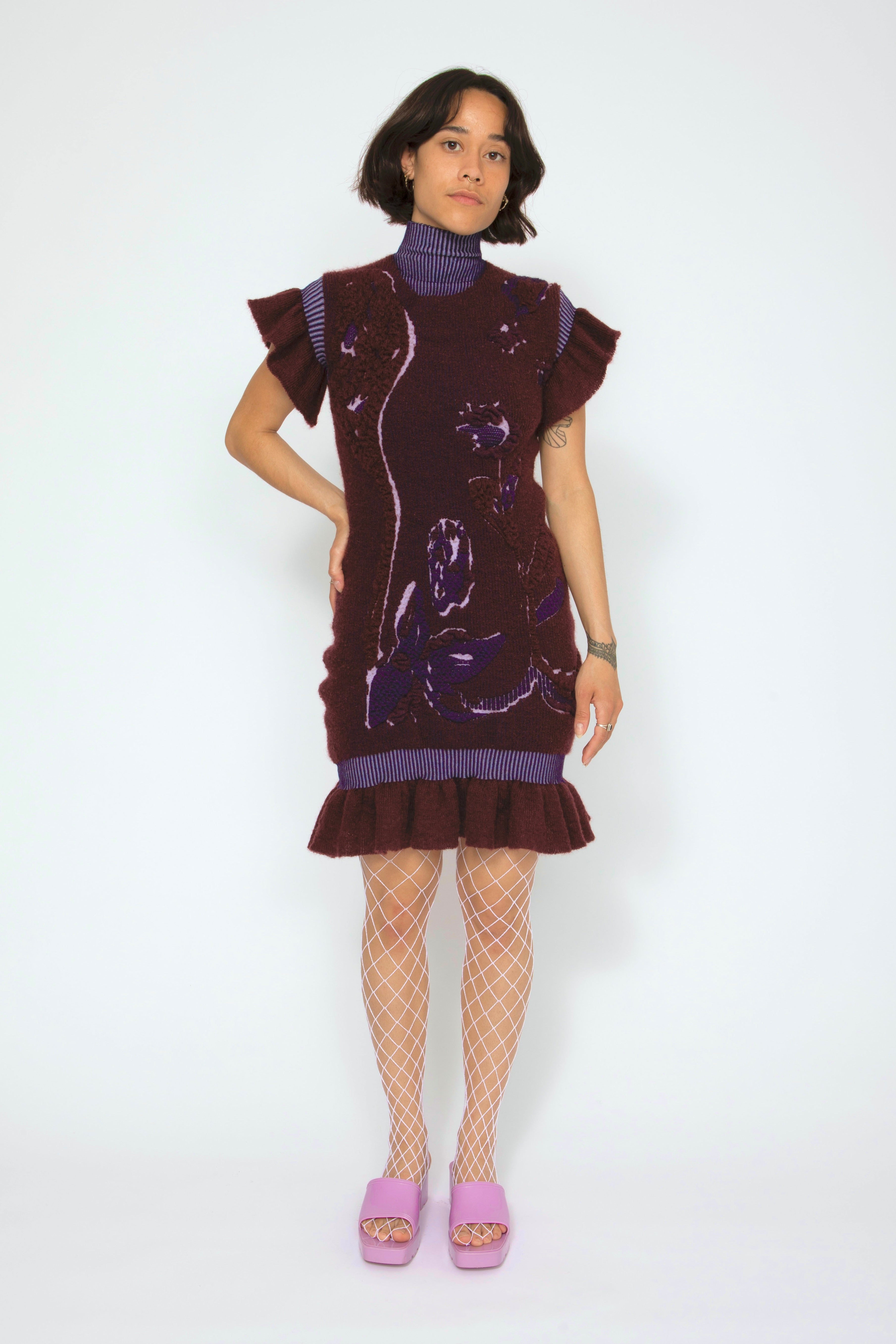 Knitted dress in 3D jacquard artwork. The fabric is slightly stretchy and has a fluffy and soft feeling. The dress has a body fitted silhouette that adapts to the body. This item is from Collection 4.