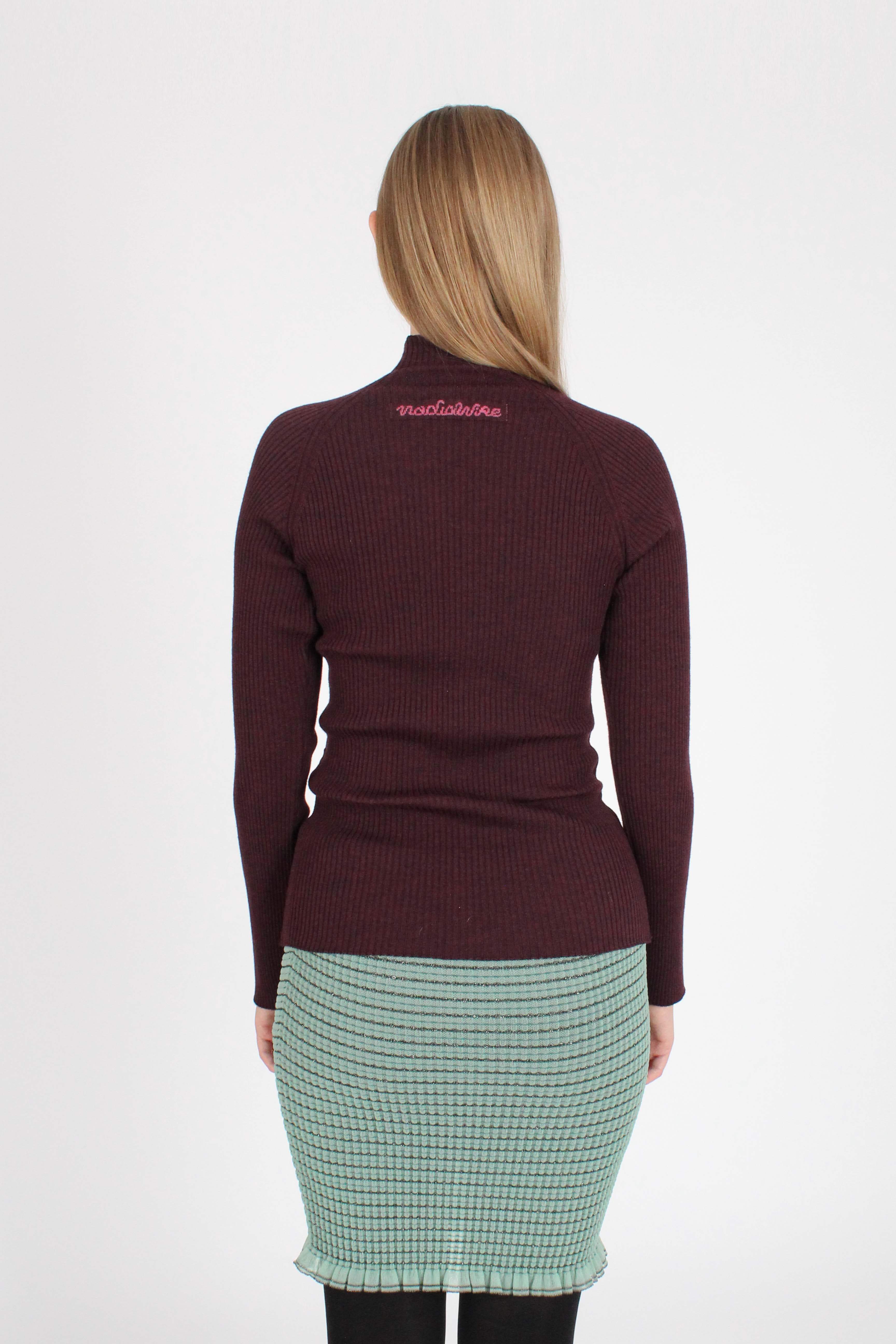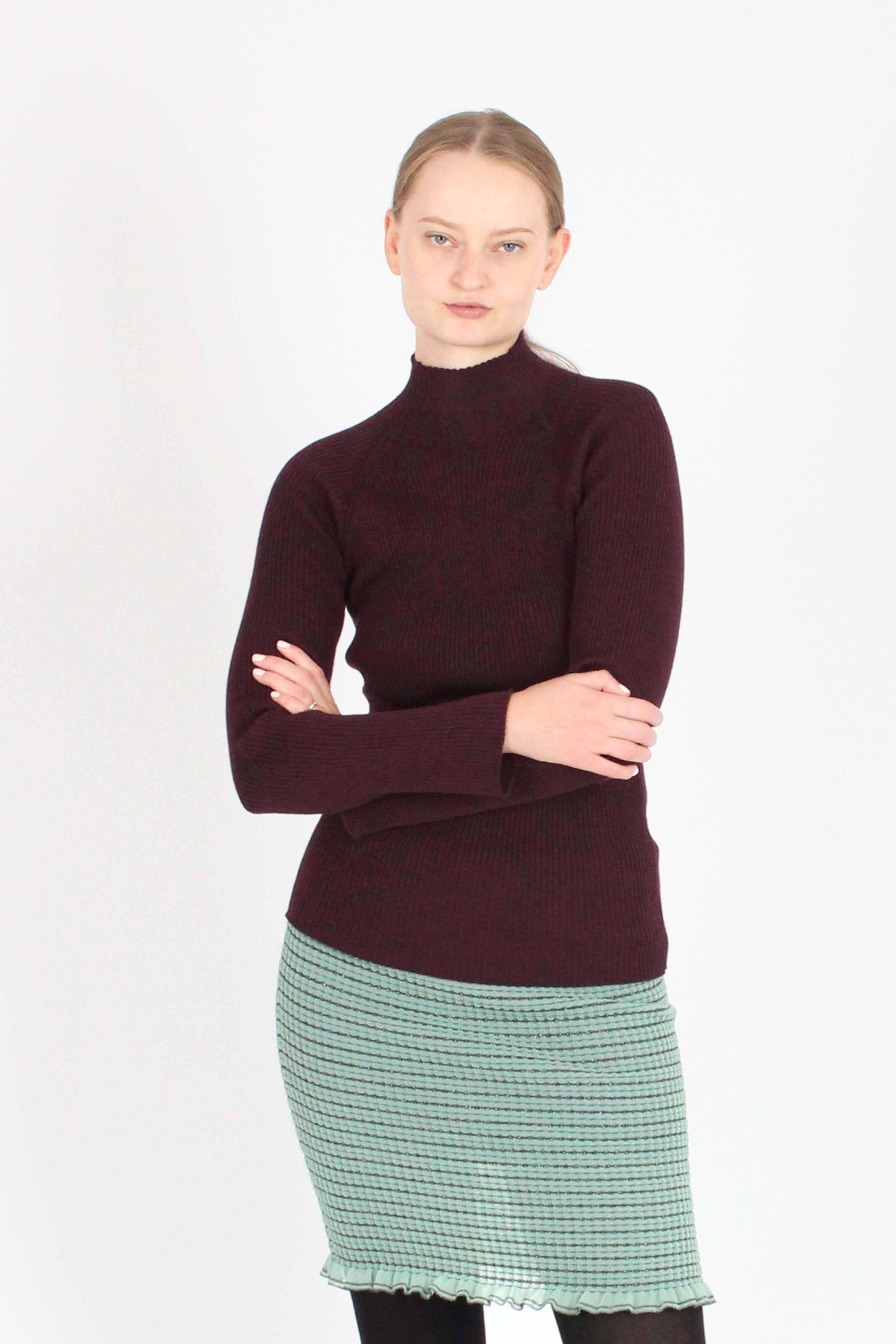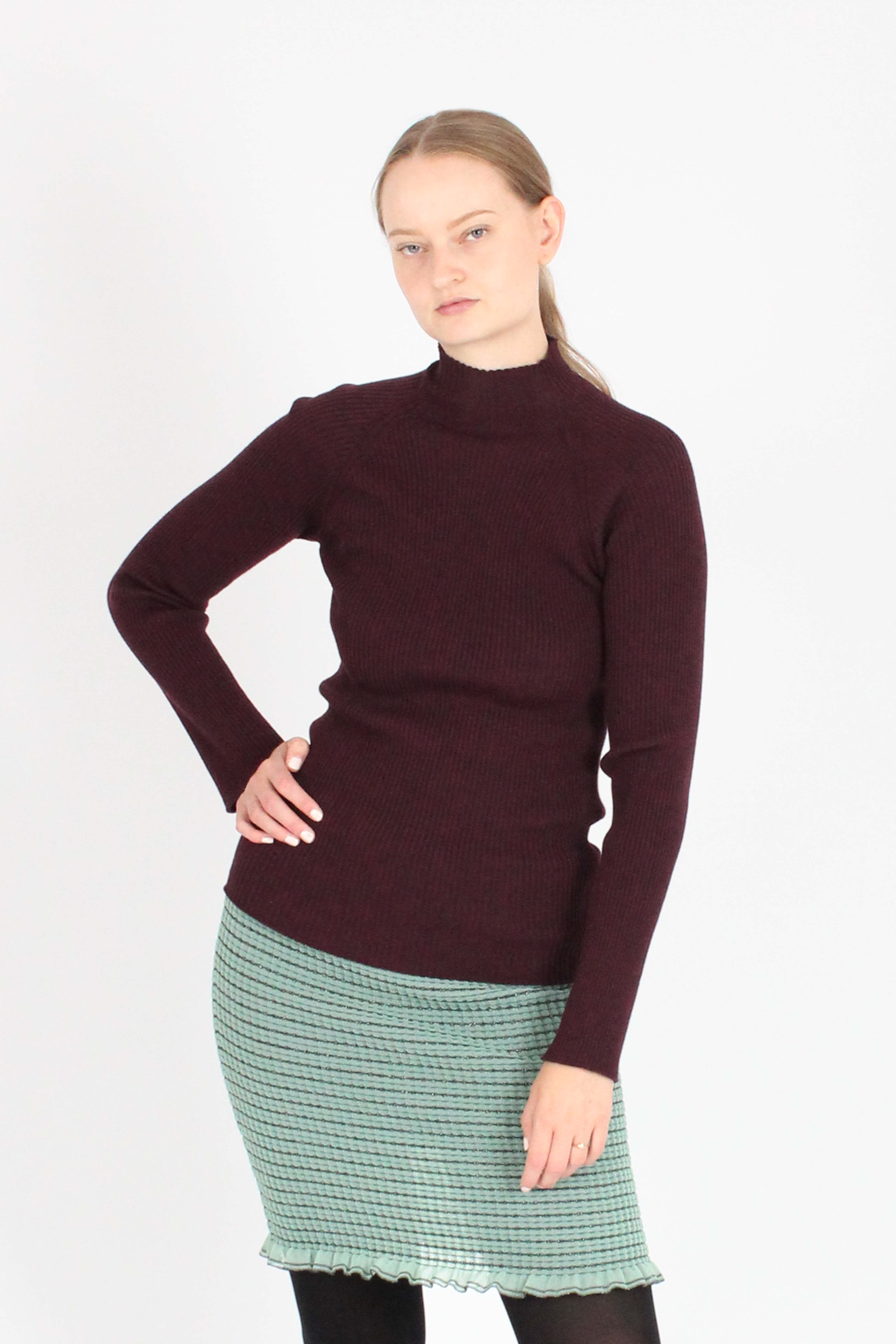 The Raglan Rib Jumper is a timeless wardrobe piece designed for both comfort and elegance. Knitted in pure merino wool, it offers natural softness, breathability and warmth. The slim rib structure creates a flattering silhouette that moves with the body. Featuring a raglan sleeve construction for ease of movement and a refined high neckline, this jumper is perfect for layering under jackets or wearing as a sleek standalone piece. The deep burgundy shade adds sophistication, making it an effortless match with both neutrals and bold colors.