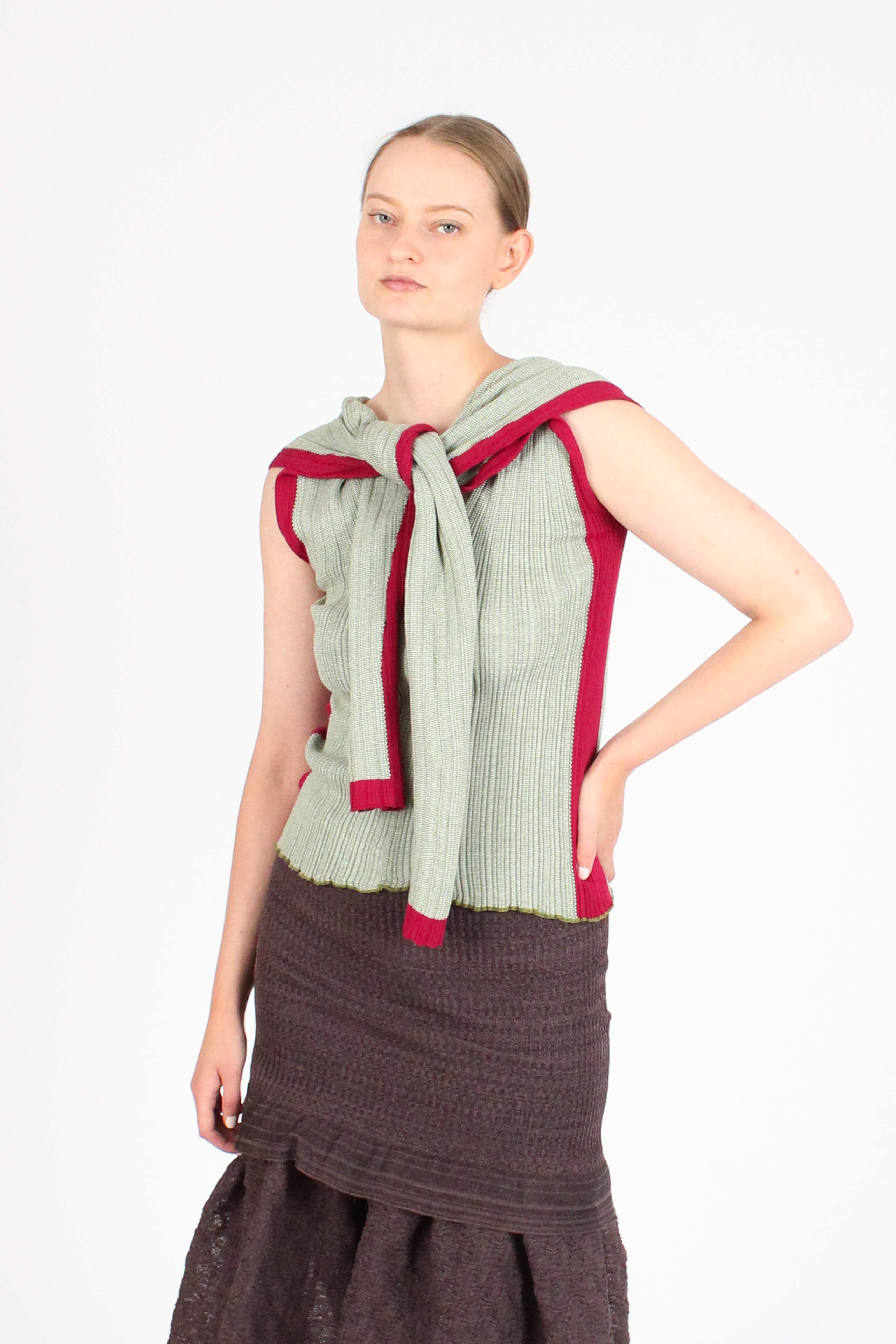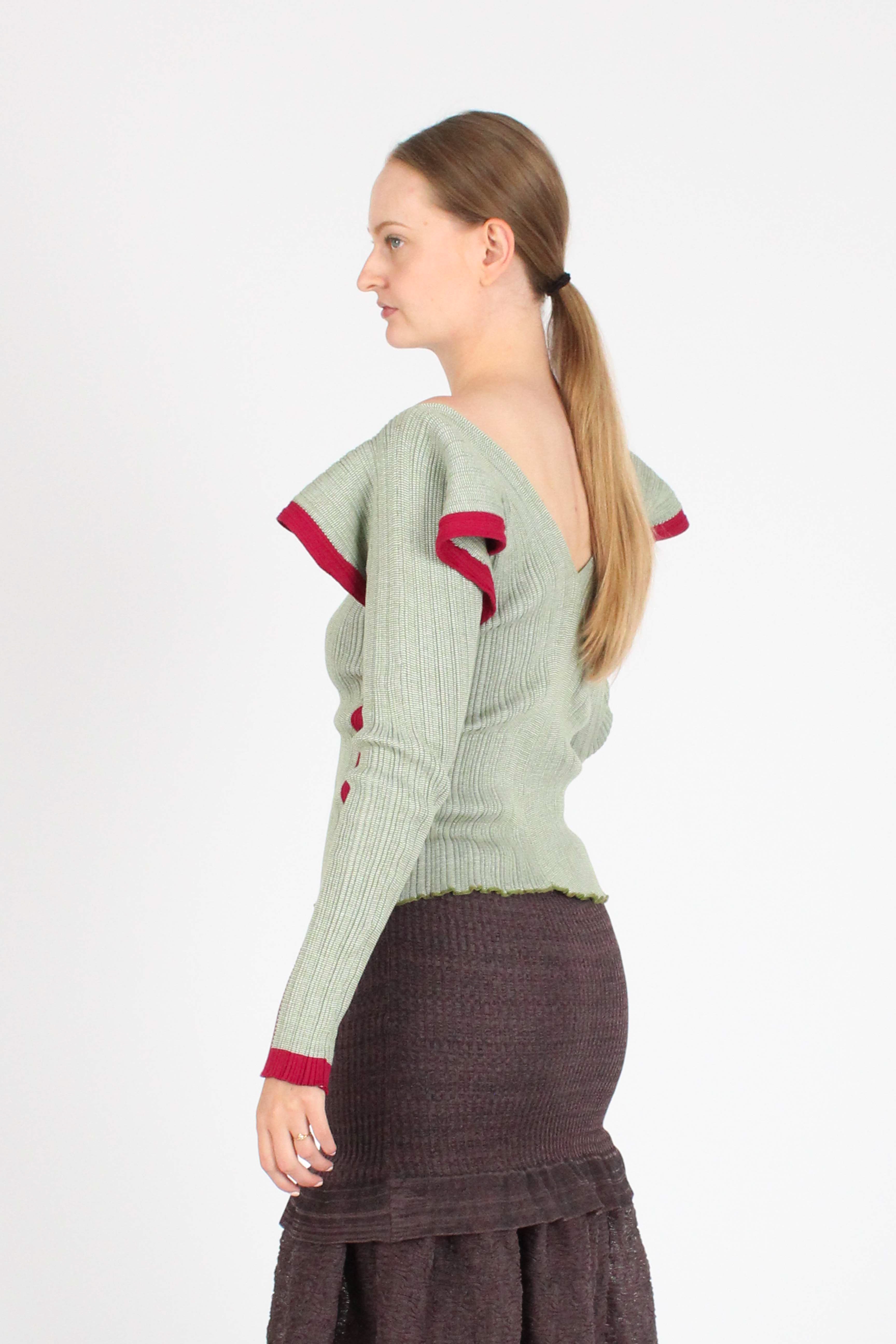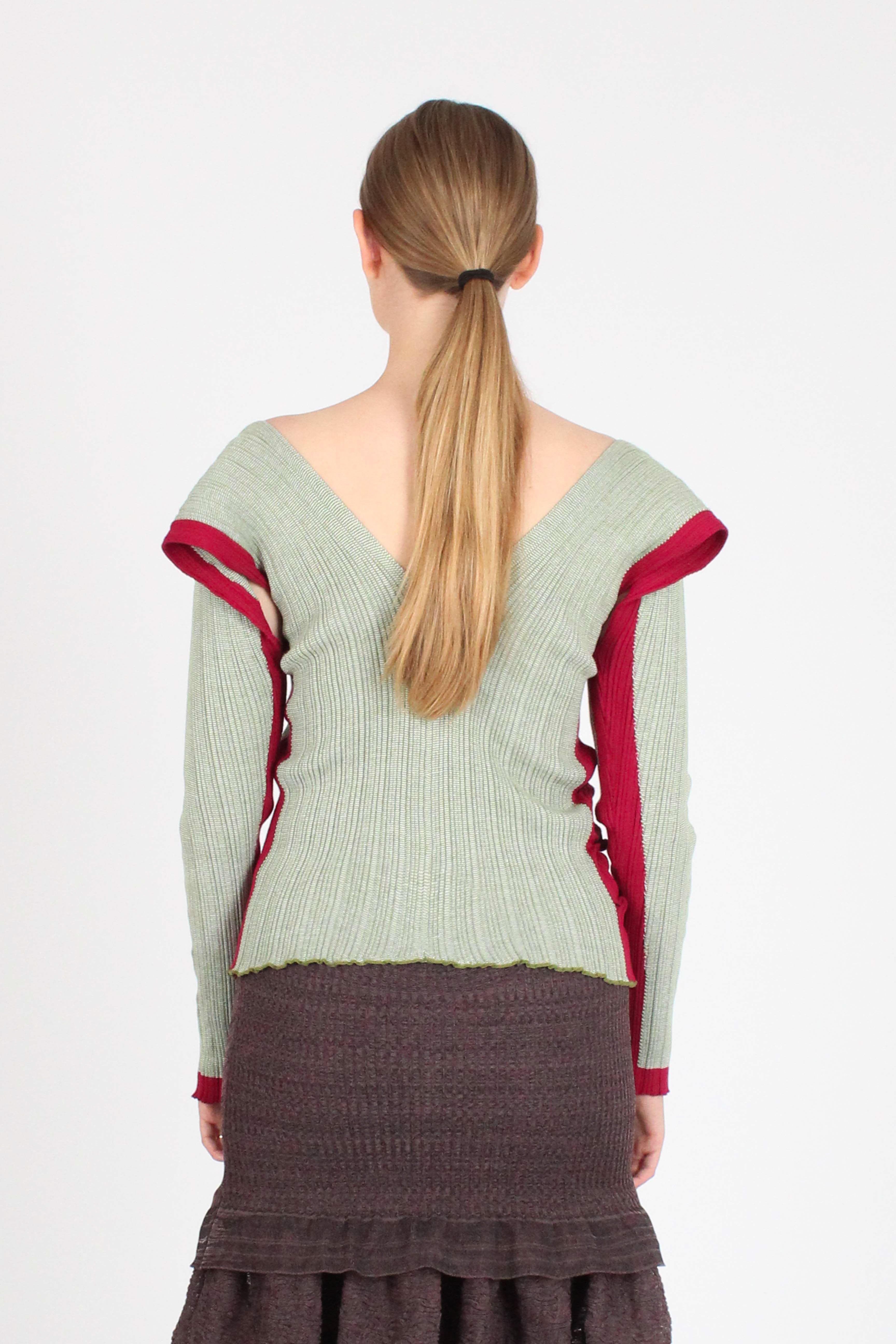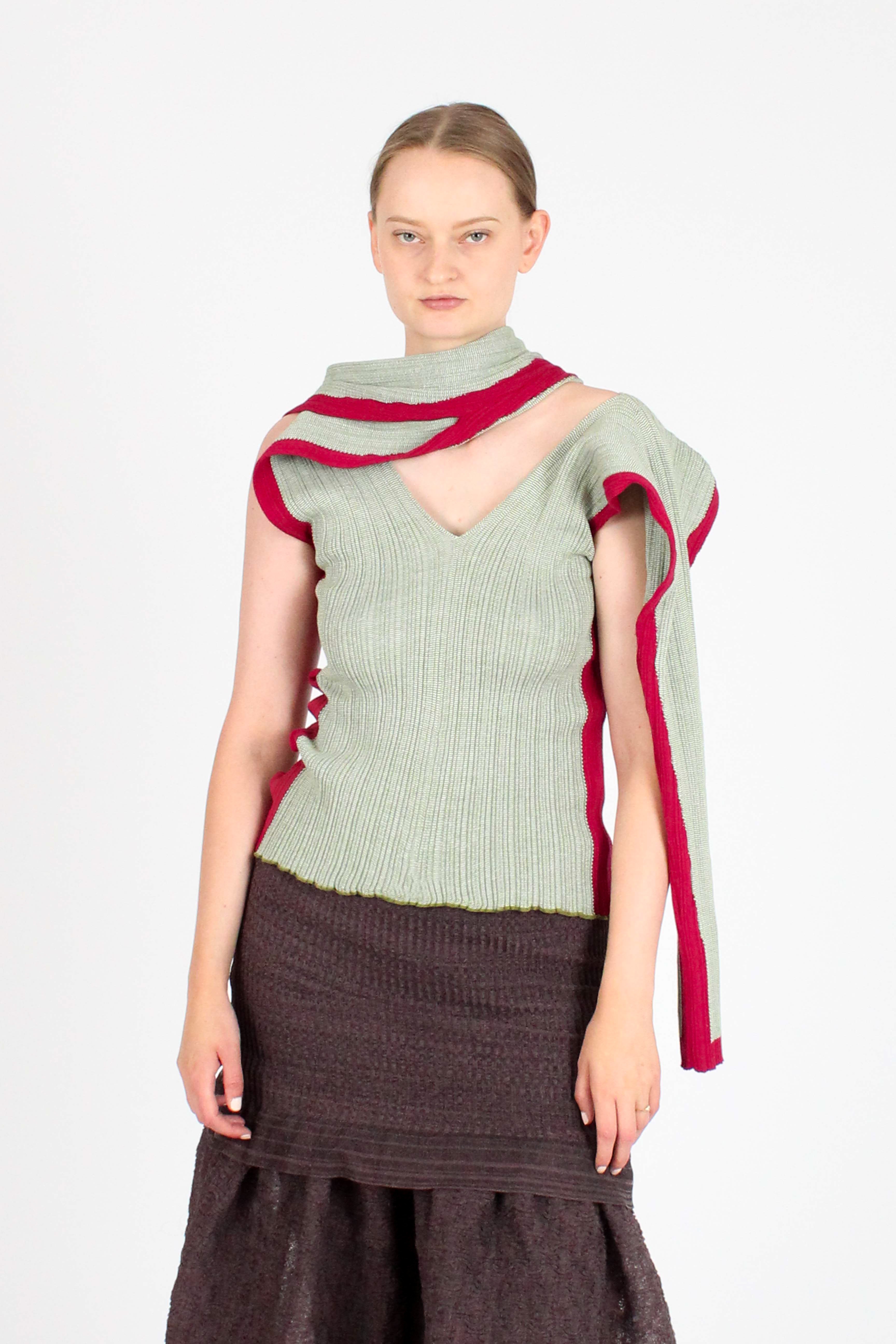 The Spiral Rib Jumper is a sculptural knit that blends comfort with playful design. Knitted in soft cotton, it feels smooth and gentle against the skin. The jumper features a ribbed texture with bold spiral details in contrasting pink edge around the body and sleeves. Designed with versatility in mind, it can be styled in multiple ways: wear the sleeves fully on for a classic fit, drape them off the shoulders for an asymmetrical look, or tie them around the body as a statement detail. Finished with a deep V-neckline at the front and back, this piece is both striking and easy to wear.