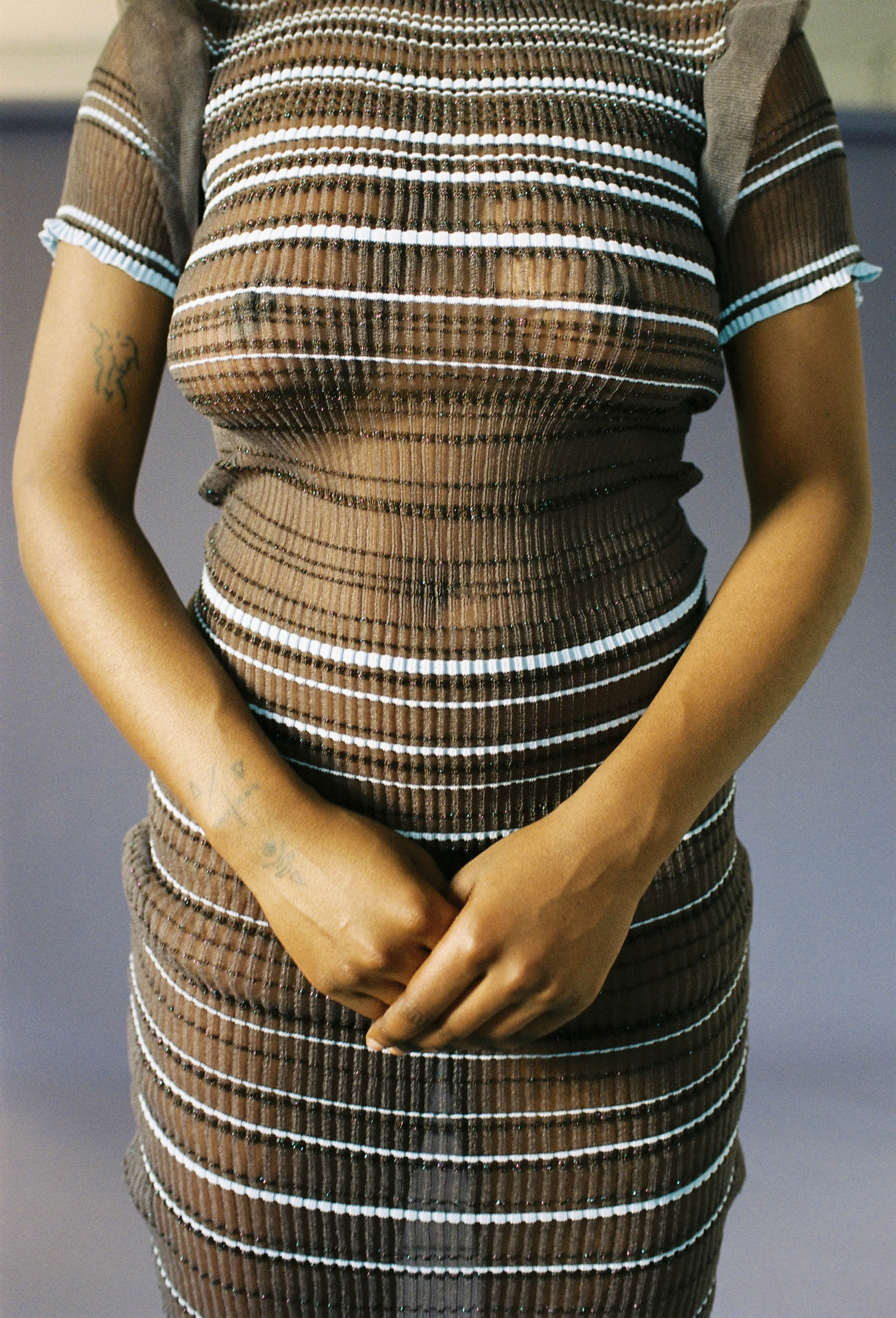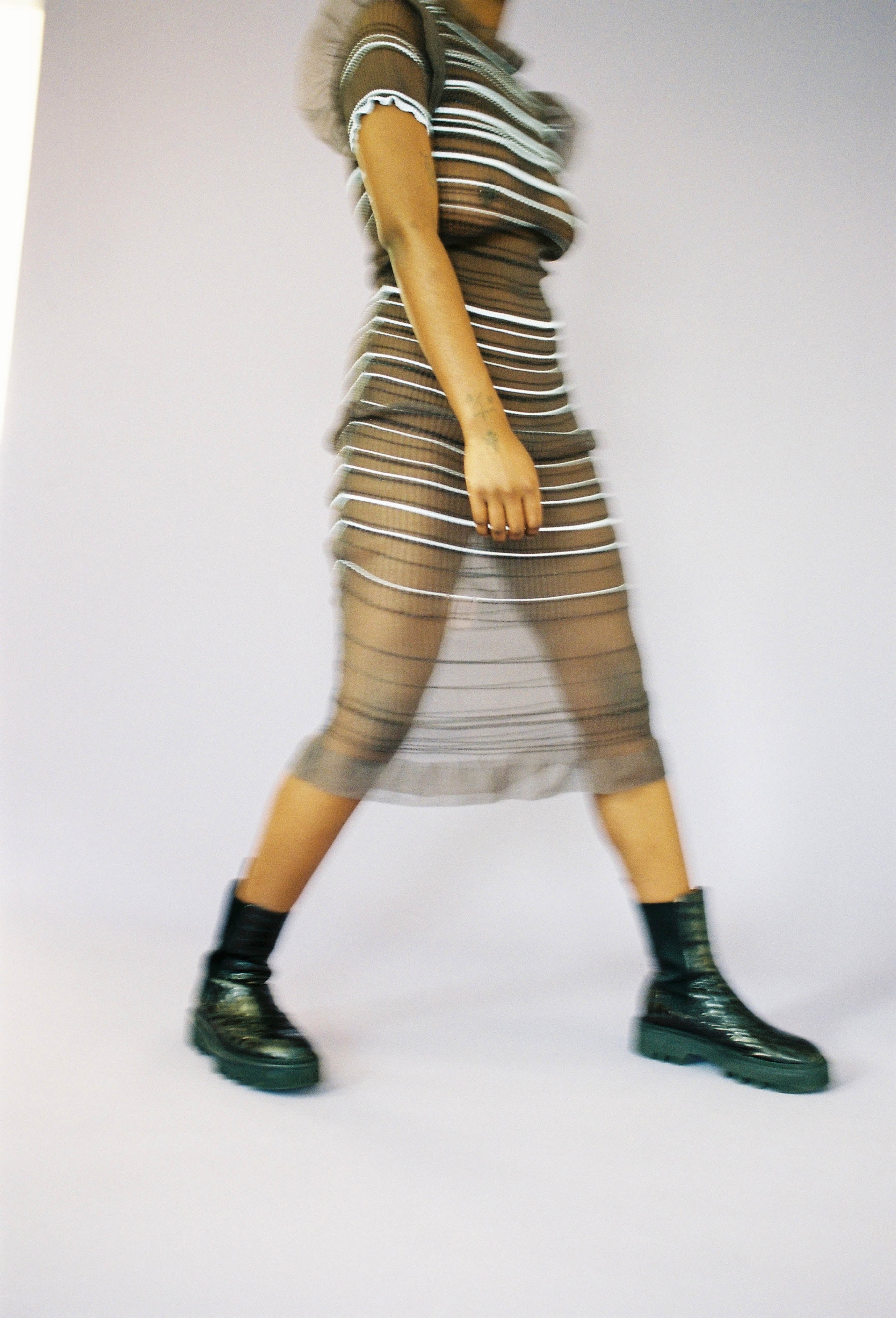Secret Stripes Dress in brown is a transparent knitted short sleeved dress with shimmery stripes. The dress is lightweight, delicate and very flexible. The dress has a body fitted silhouette that adapts to the body. This item is from Collection 1.